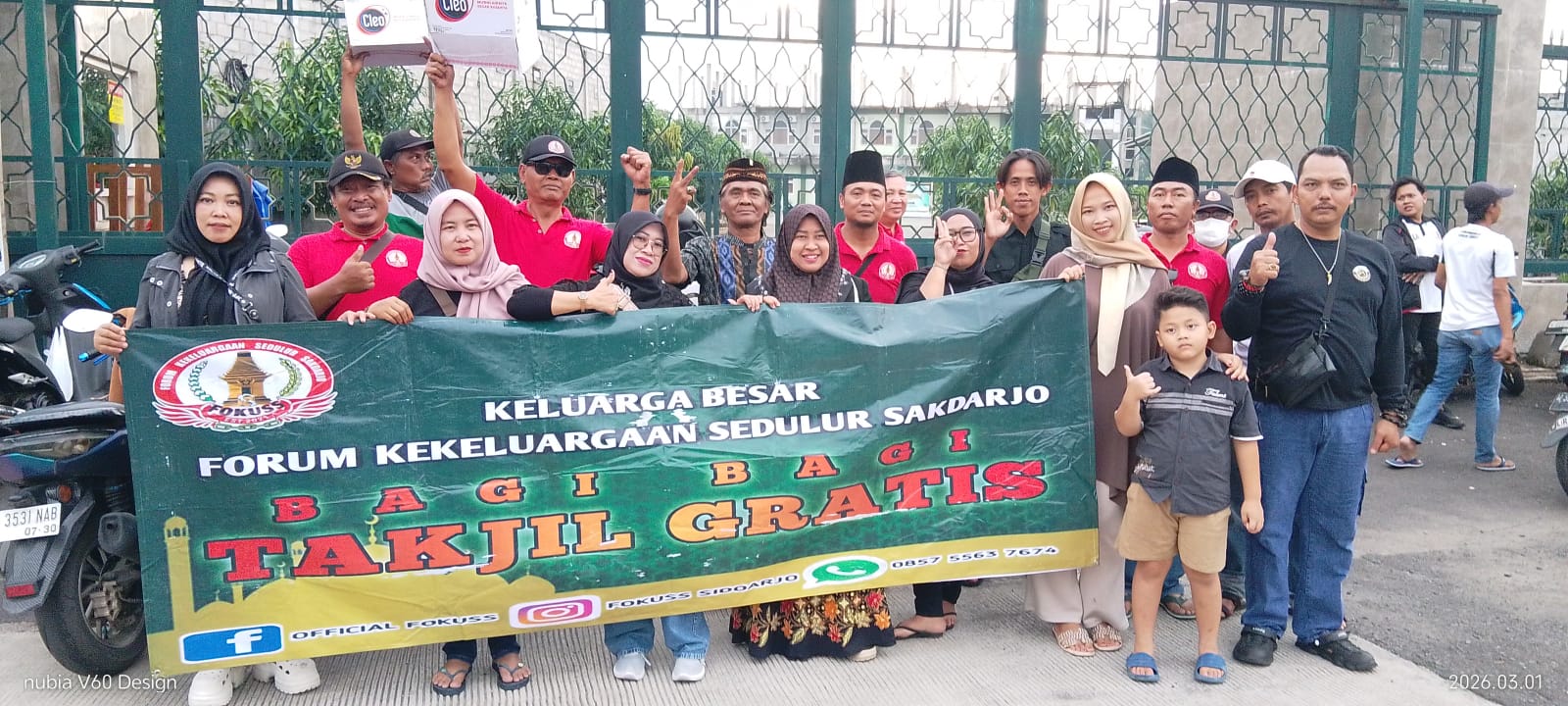 SIDOARJO|www.pilarcakrawalanews.com//Bulan suci Ramadhan merupakan bulan yang di nanti seluruh umat muslim, momen di bulan yang penuh berkah ini pergunakan keluarga besar Forum Kekeluargaan Sedulur Sakdarjo (FOKUSS) untuk berbagi kebahagiaan dengan berbagi takjil pada Minggu petang ( 01/03/2026).