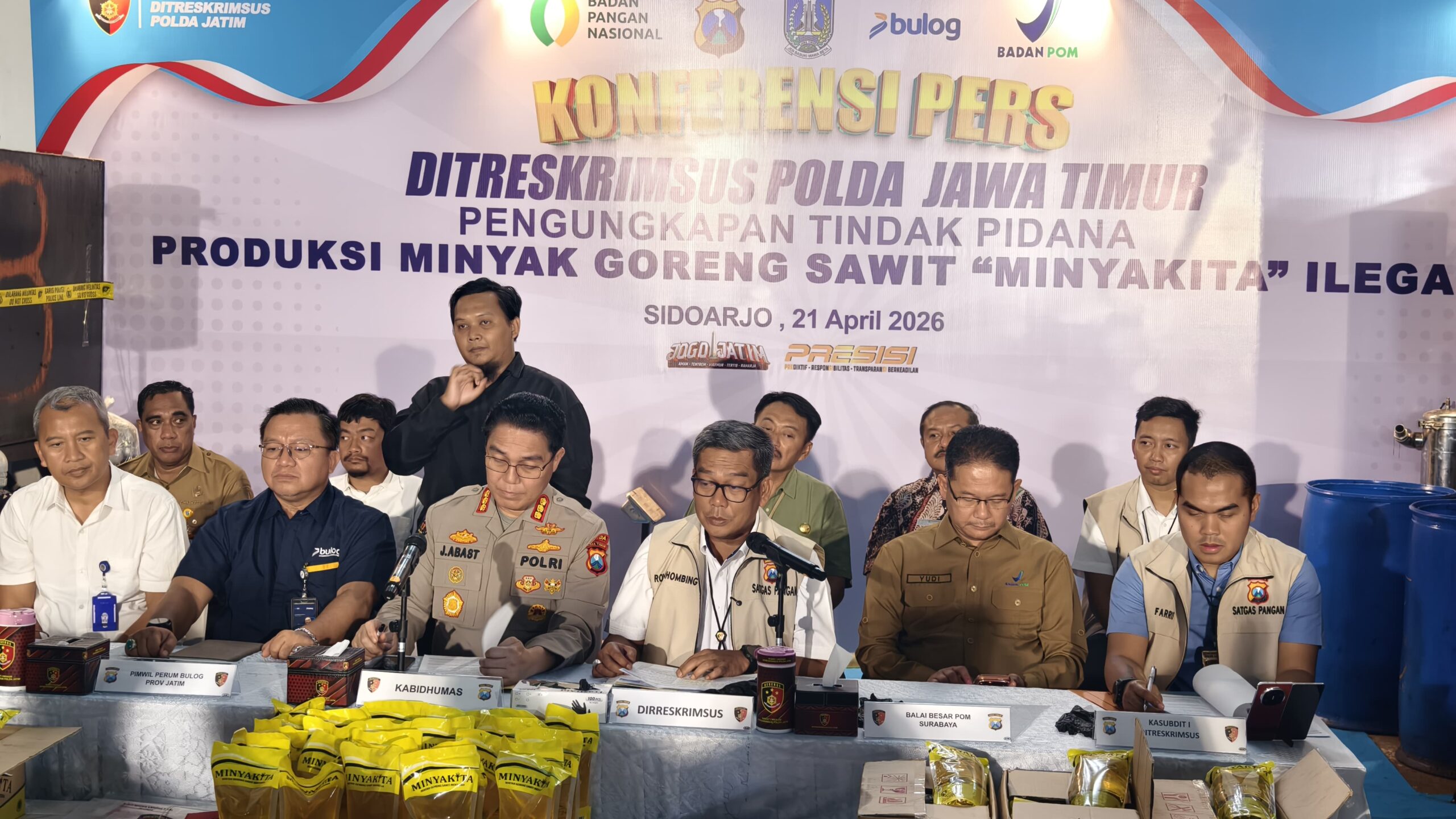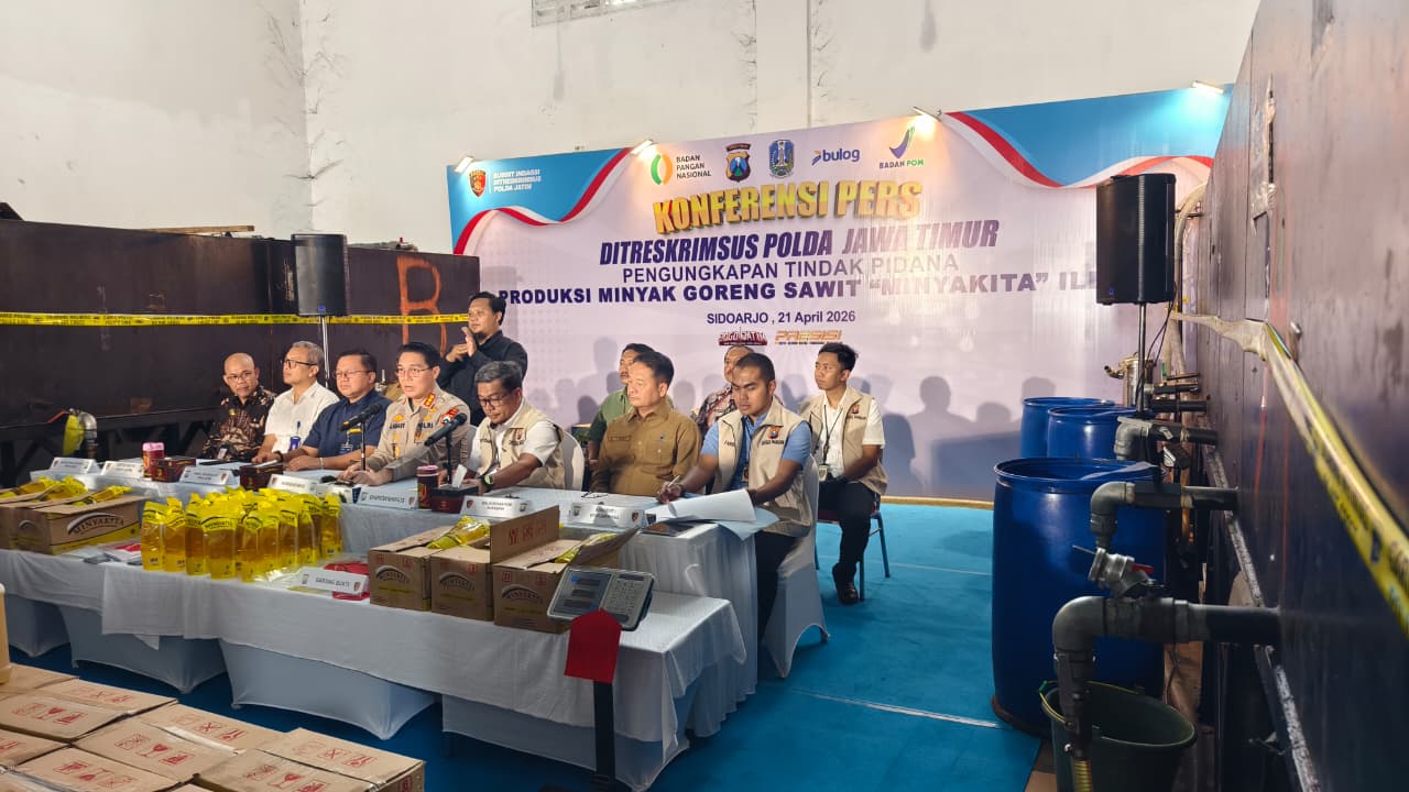 Sidoarjo// www.Pilarcakrawalanews.com |Aparat kepolisian berhasil mengungkap praktik produksi dan peredaran minyak goreng merek Minyakita yang tidak sesuai standar di Kabupaten Sidoarjo, Jawa Timur. Dalam kasus ini, empat orang telah ditetapkan sebagai tersangka, (Selasa 21 April 2026).