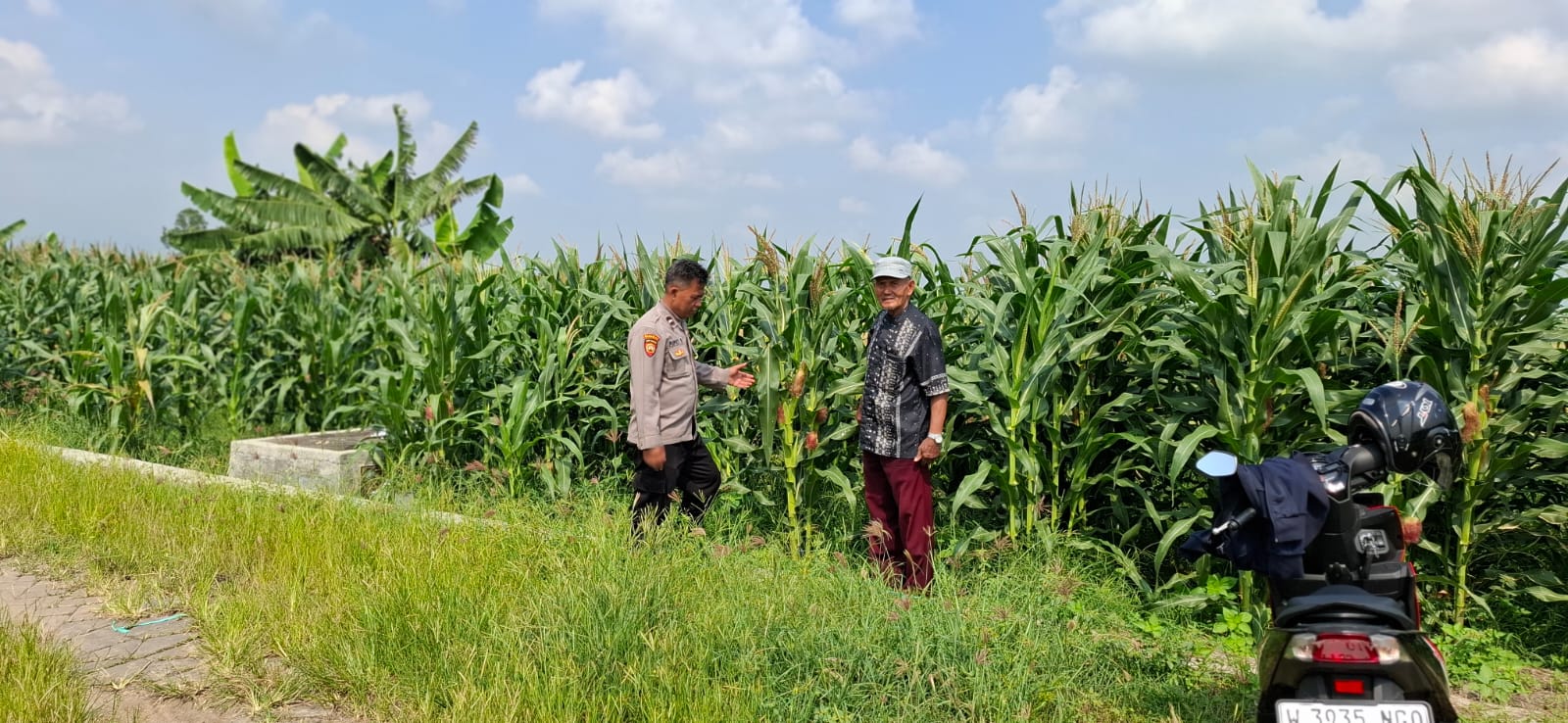 Dalam kegiatan tersebut, Aiptu Puput meninjau langsung kondisi tanaman jagung yang saat ini telah memasuki usia sekitar dua bulan. Ia juga memberikan motivasi kepada petani agar terus melakukan perawatan secara optimal guna mendapatkan hasil panen yang maksimal.